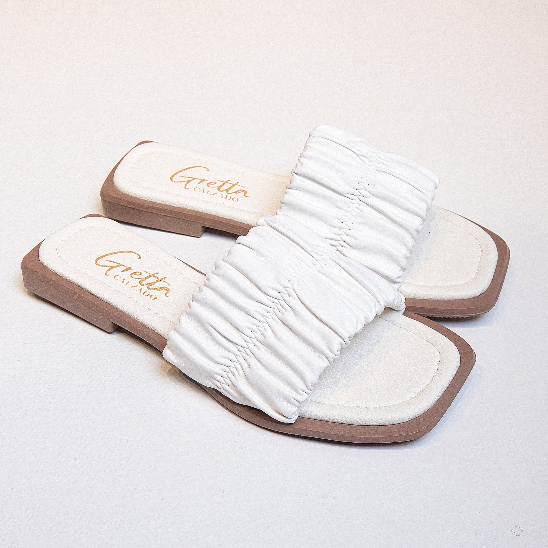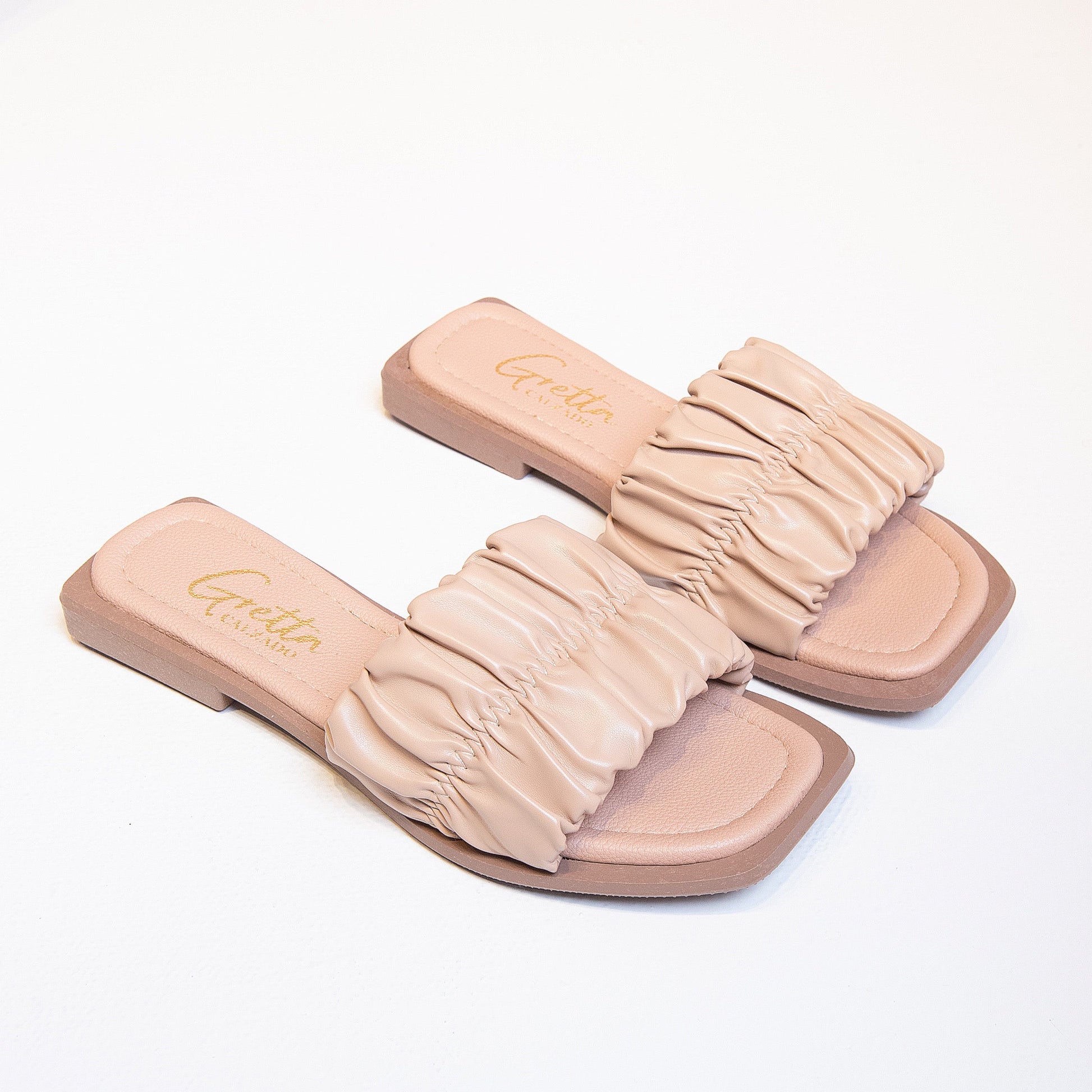 Sandalia plana con tira ancha fruncida en material sintético premium tipo napa vegana. Diseño cuadrado moderno con suela ligera de 2 cm y plantilla acolchada. Estilo elegante y versátil para looks de día y de noche.