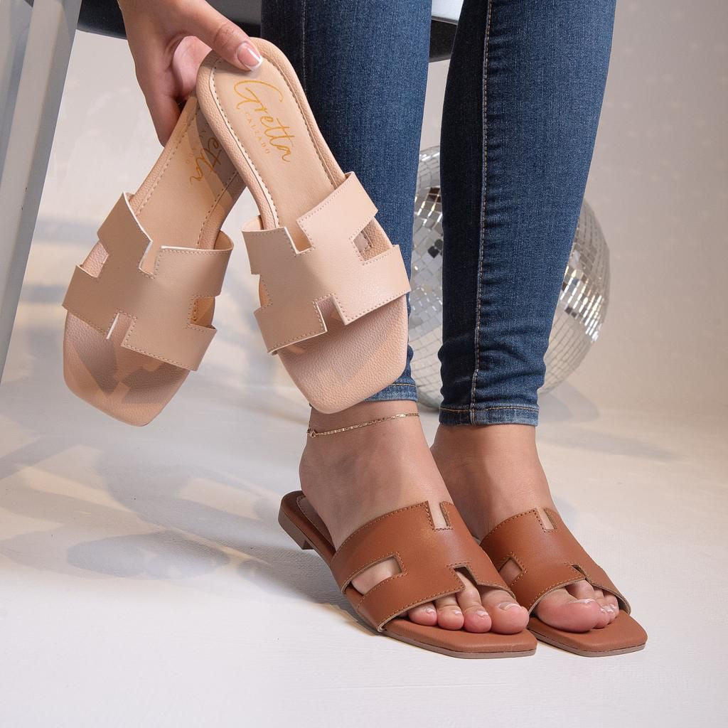 Sandalia plana en material sintético premium con acabado napa vegana, detalle de hebilla decorativa y diseño cuadrado elegante. Suela ligera de 2 cm y plantilla acolchada que combinan estilo y confort en cada paso.